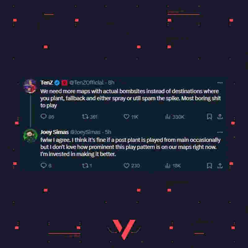 TenZ在社交媒体上发表了对无畏契约地图设计的看法。他表示,游戏需要更多“真正的爆破点”,而不是那些仅仅适合安放爆能器后撤退然后进行技能或枪械骚扰的地点。他称这些游戏体验为“最无聊的玩法”。
