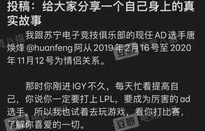 然而S赛之后,决赛表现不佳的huanfeng火速塌房,被爆出多次隐瞒女友和自己的女粉丝约炮,大家还发现huanfeng不仅在世界八强赛期间与荔枝姐约会被拍到,还被发现半决赛宣传片脖子上有草莓印。
