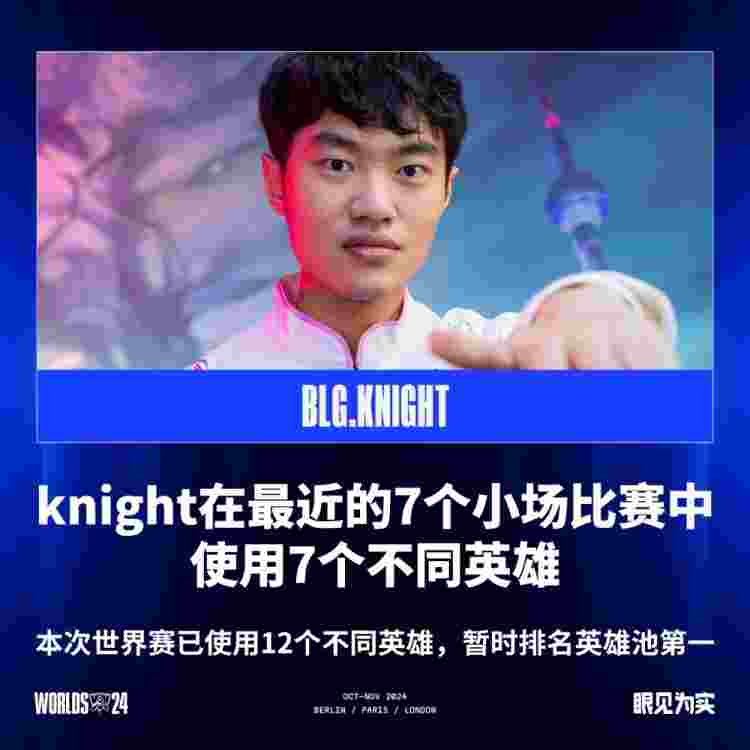 直播吧10月27日讯 2024英雄联盟全球总决赛正在进行,据统计knight选手在最近的7个小场比赛中使用7个不同英雄,且本次世界赛已使用12个不同英雄,暂时排名2024全球总决赛选手英雄池第一。