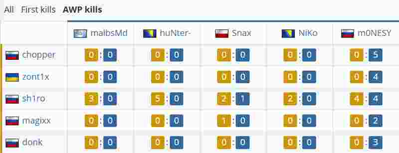 狙击手对位上,sh1ro和m0NESY打成4-4平手。