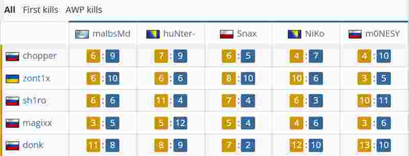 全部对位上,donk面对malbsMd有11-8的对位、面对NiKo 12-10、面对m0NESY 13-10。除了他之外,还能和G2队员掰手腕的只剩下了sh1ro。