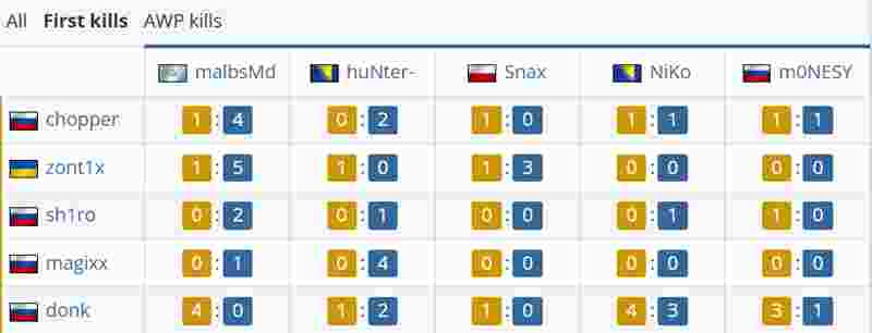 首杀对位上,donk为队伍拿到了13个首杀,G2方面最高的是malbsMd,为12个首杀。