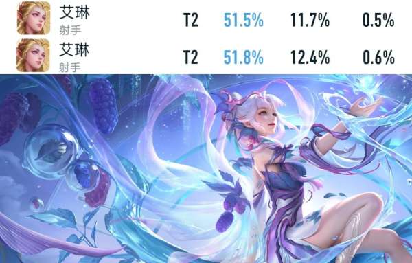 两大英雄由于1技能加强,全分段胜率也出现了上涨的情况,狂铁由于1技能的回血增加,全分段胜率已从47.3%上涨至47.4%,艾琳由于1技能的伤害增加,全分段胜率已从51.5%上涨至51.8%。