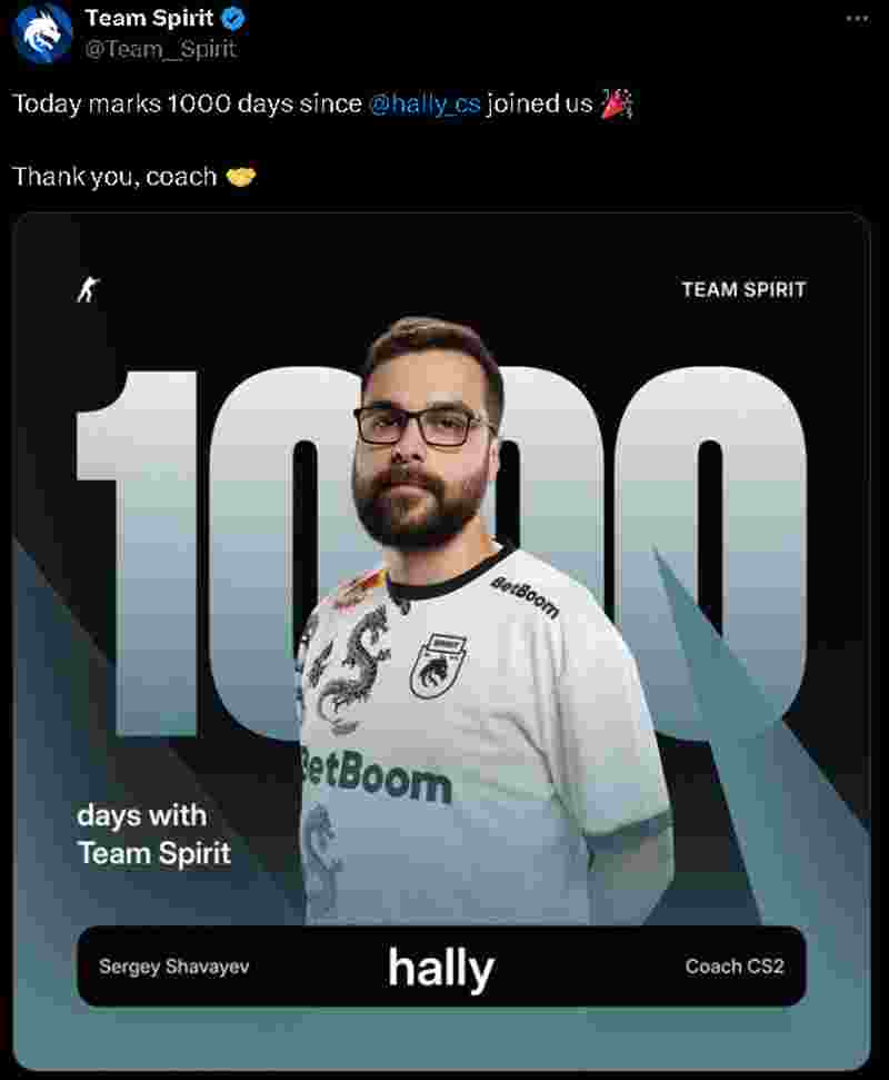 Spirit在BLAST 世界总决赛2024中成功晋级总决赛,而就在今天,队内教练hally达成了执教Spirit一千天的成就。