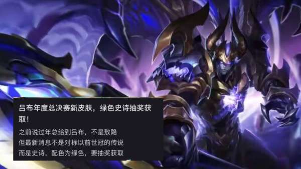 根据博主透露的消息,吕布这款年度总决赛专属皮肤的配色是绿色,皮肤的品质是史诗限定,据说这款皮肤需要通过抽奖的方式才能过获得,因此皮肤的价格估计也不会便宜。