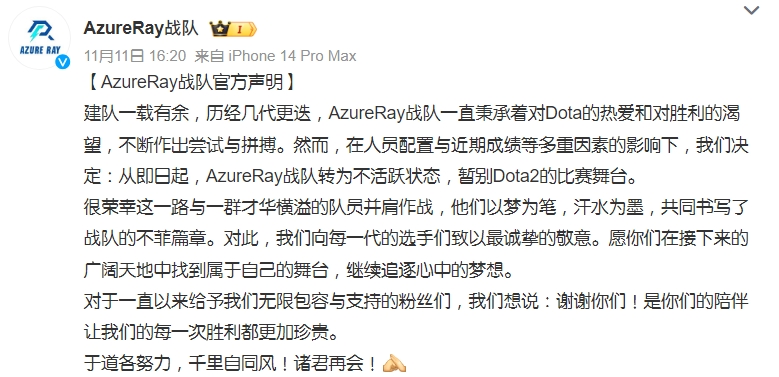 近日,AzureRay战队官方微博发布一条消息,宣布战队进入不活跃状态,暂别Dota2的比赛舞台。原文如下: