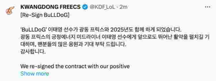 BuLLDoG选手将在2025年与KDF同行。期待他作为KDF充满积极能量的中单选手未来展现出众的表现,希望粉丝们多多应援和期待。