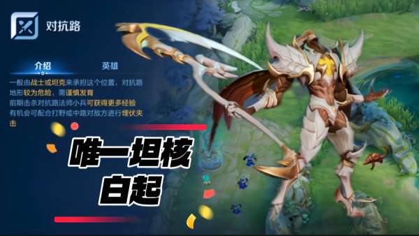 在三体人强势的对抗路,白起,可以与三体魄较量一番,而到了重装流强势的版本,白起凭借着重装流红利,更是成为了对抗路的T0英雄。