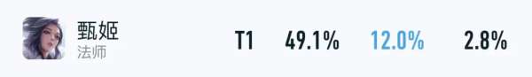 以上则是甄姬目前的巅峰赛数据,胜率直接从赛季初的52%降低至49.1%,缩水了3%,就连出场率都仅有12%了,属实尴尬。