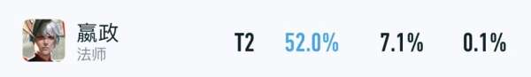在顶端局里,嬴政目前的胜率为52%,出场率则是7.1%,虽然优先级并不算太高,但已经完全能用了。
