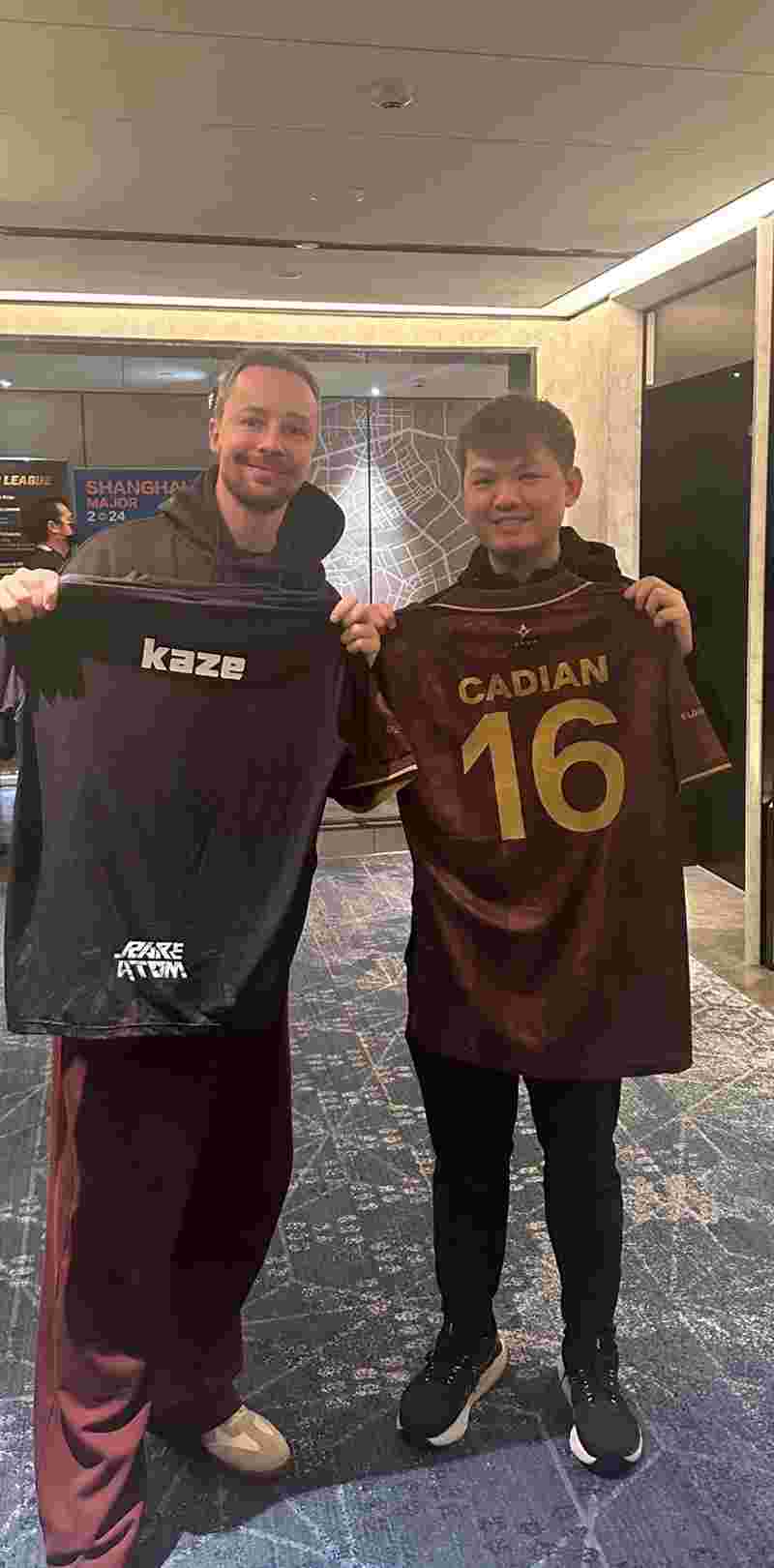 Rare Atom的kaze在社交媒体上发布了一张其与cadiaN互换队服的合照: