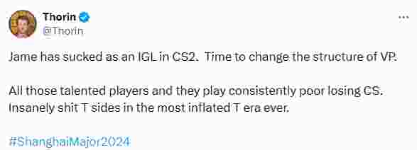 Virtus.pro以1胜3负的战绩告别本次上海Major赛事后,英国知名电竞记者Thorin在个人社交媒体账号上分享了对Virtus.pro战队和指挥Jame的看法。