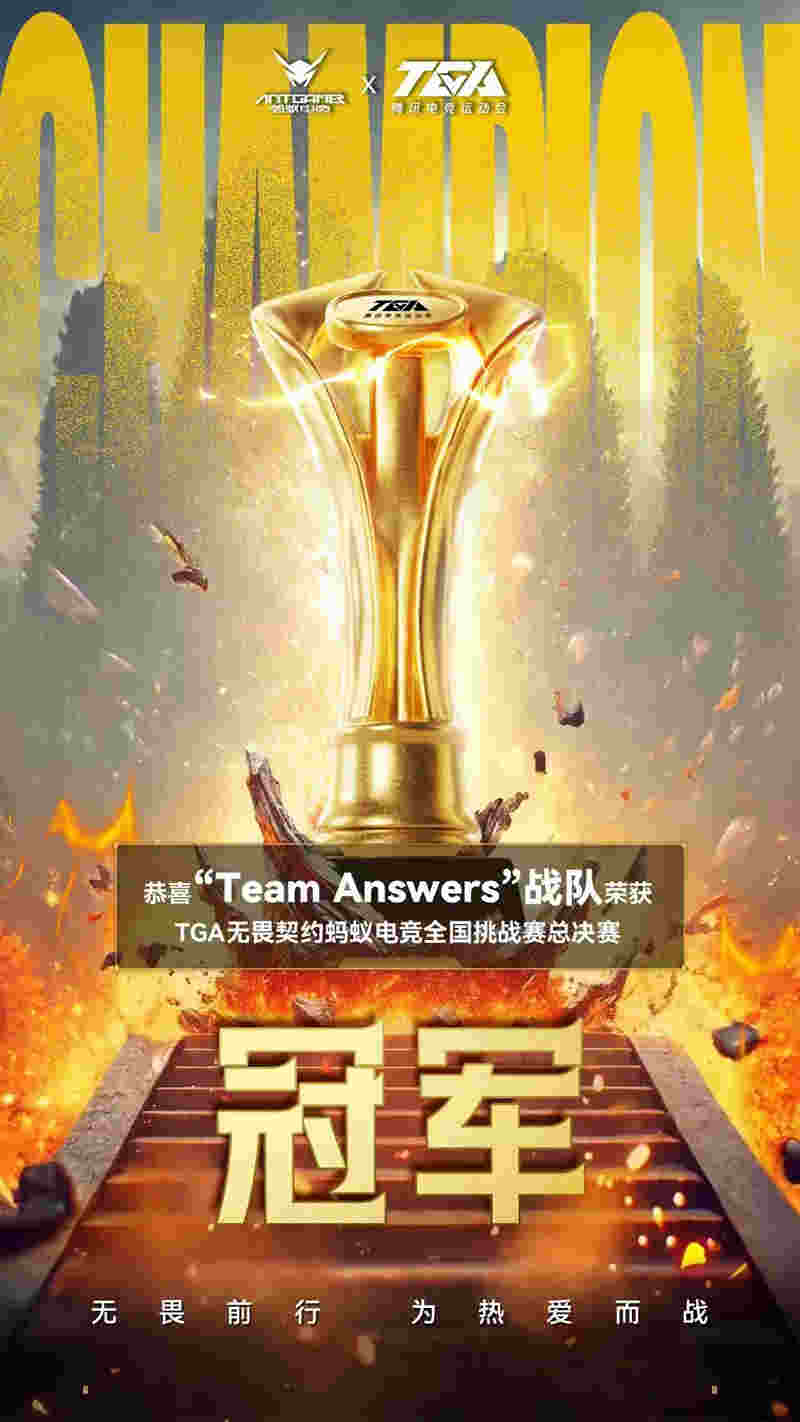TGA无畏契约蚂蚁电竞全国挑战赛的总决赛已经圆满落下帷幕,荣耀的曙光照亮了舞台,胜利的旗帜在风中猎猎作响,“Team Answers”战队凭借着超凡脱俗的实力与无懈可击的默契配合,穿透了重重挑战,征服了整个赛场,成功登顶无畏契约的宝座!