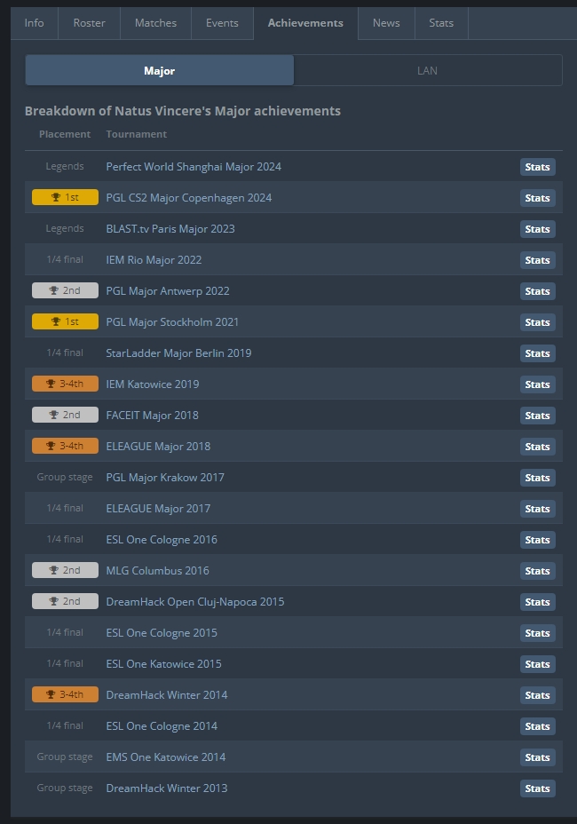NAVI历史上一共参加过全部的21届CS Major赛事,其中两次夺得冠军,分别是PGL 斯德哥尔摩Major和PGL 哥本哈根Major。