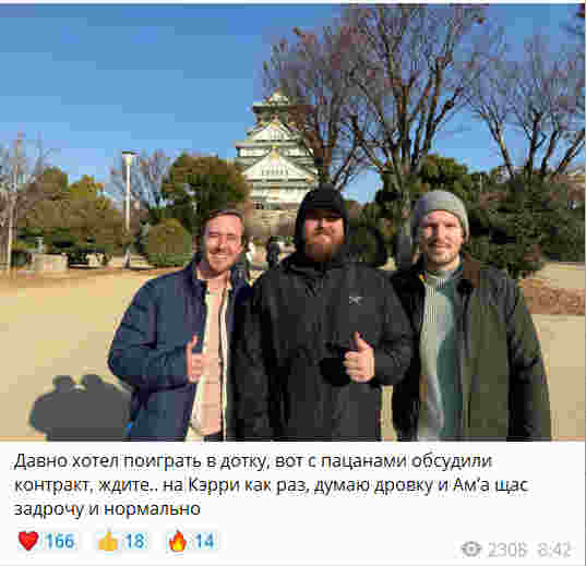 新科CS冠军指挥、Team Spirit选手chopper在个人电报频道分享了一张与Dota2选手CCNC以及Cr1t在日本的合影并配文称"其实我想打刀塔已经很久了,于是我和身边的这两位聊了聊合同,等下.... 让我打carry?我只会玩小黑和敌法可以吗???"