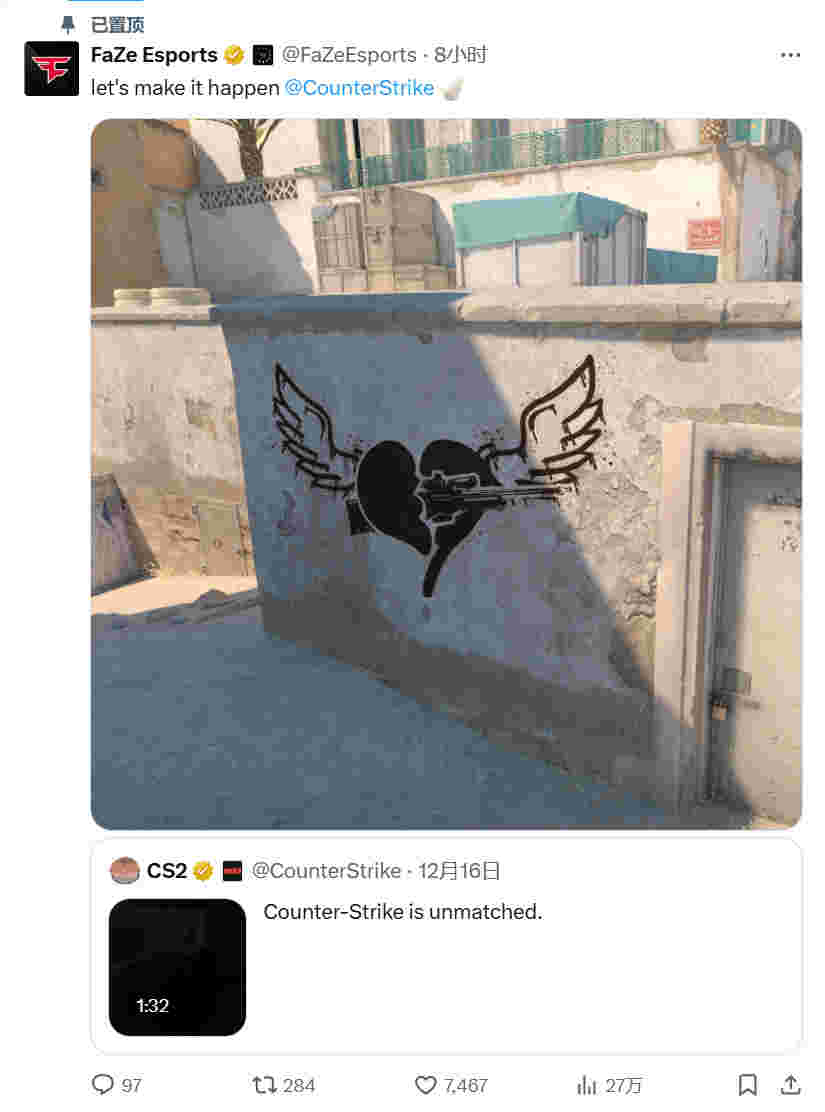 FaZe则自制了一个盲狙天使的涂鸦,其中的爱心形状就像ropz近几年的贴纸一样。