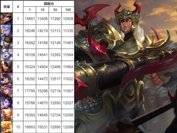 目前国百战力最高的英雄是马超,之后依次是裴擒虎、暃、韩信、镜、影、澜、嫦娥、露娜和诸葛亮。