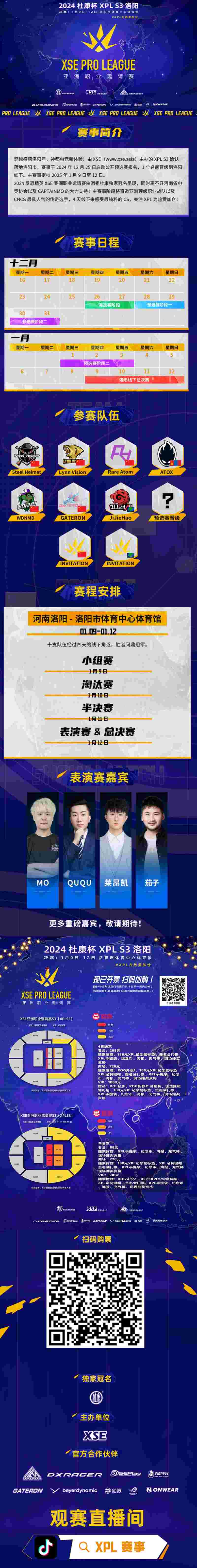 由歆赛电竞主办的XSE亚洲职业邀请赛S3,即XPL洛阳,门票将于12月25日17点开售(猫眼平台)。