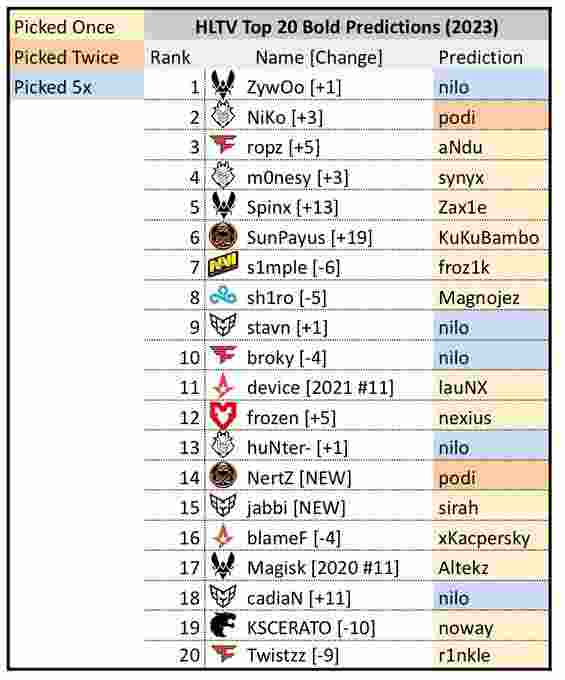 从2016年起,每年登上年度Top20行列的选手增加了一项额外的内容,那就是预测明日之星。虽然不同职业哥给出的观点的也不尽相同,但也有不少天才少年用自己的个人发挥征服了众多职业哥,比如2021年的m0NESY,当时他一共获得了八次提名,s1mple、NiKo和Ax1Le等人都对m0NESY印象深刻,而太子在2022年也强势进入Top20第七名,堪称惊艳。但也有一些备受看好的明日之星们因为各种各样的原因而未能闪耀,比如headtr1ck。去年最被看好的则是nilo,他获得了五次提名。今天就来盘点下去年被看好的明日之星们在今年的发挥。