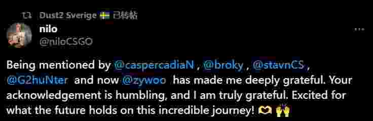 在2023年明日之星预测中,收获最多提名的是nilo。一共有五位顶级选手提名他作为明日之星,其中包括当年的Top1选手ZywOo。当时nilo在社交平台上表示:“被cadiaN、broky、stavn、huNter-和ZywOo提名让我深为感激。你们的认可让我更加谦逊,真的非常感激。这段不可思议的旅程还在继续,期待未来!”社区也期待着这位18岁的年轻选手能成为瑞典下一代领军人物。