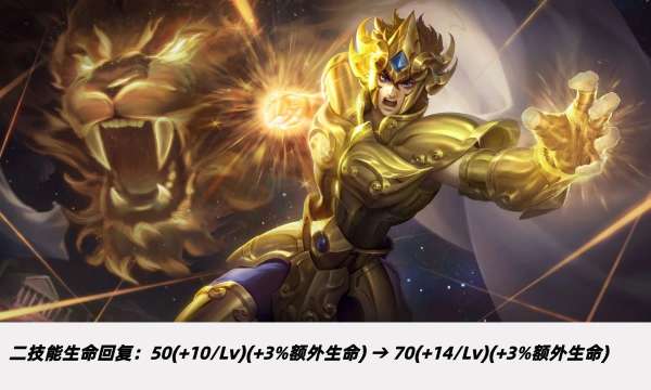大招回血上调50点基础数值和0.5%额外生命加成,下调50点等级成长,后期额外生命值>1000点属于加强。