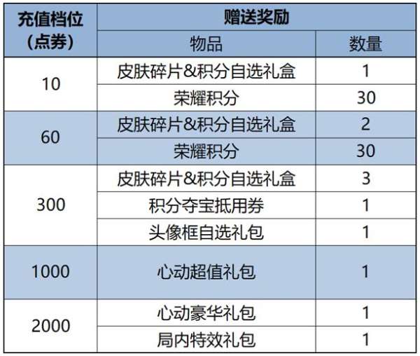 活动时间1月9日-1月12日,每日充值到指定档位,可领取皮肤碎片、荣耀积分和局内特效礼包等奖励。