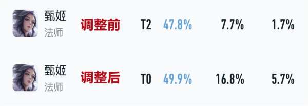 1.9日版本更新:甄姬修复了二技能击杀目标后无法继续弹射的问题,调整后巅峰赛出场率大涨9.1%、胜率大涨2.1%。