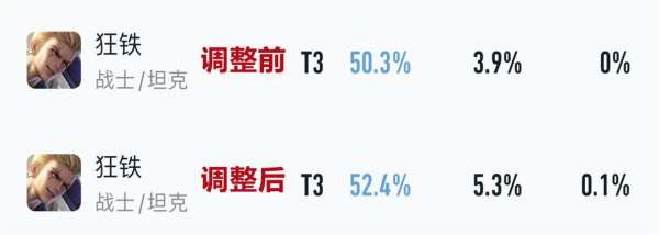 1.9日版本更新:狂铁普攻/技能回复能量前期下调、中后期上调,新增效果在泉水时可以回复能量,调整后巅峰赛胜率大涨2.1%。
