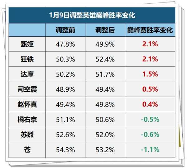王者荣耀正式服昨日版本更新,8位英雄迎来了调整,调整后最新巅峰赛胜率已经出炉。