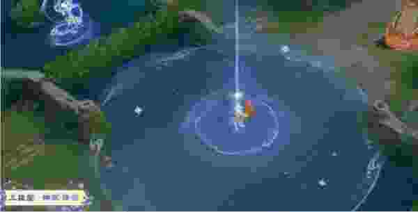 女娲传送时浮现星河,传送点上方灵蛇从天而降,落地灵池激起水涡纹样。
