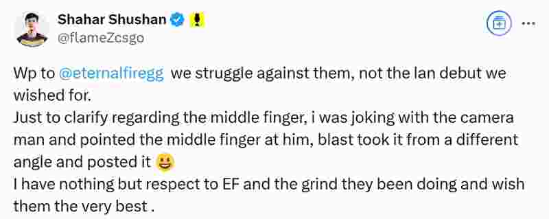 我想解释一下竖中指这件事。我是在和摄影师开玩笑,对他做了这个手势。BLAST在直播中从另一个角度截取了画面并展示出来。我尊重Eternal Fire战队以及他们的努力。祝他们一切顺利。”