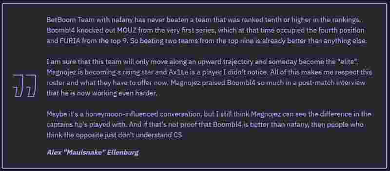 也许这只是蜜月期的影响,但我依然认为Magnojez能看出他所经历的队长之间的差异。如果这还不足以证明Boombl4比nafany更强,那么那些认为相反的人就根本不懂CS。”