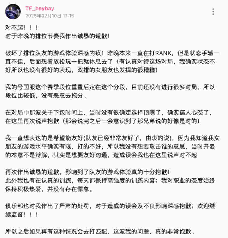 对于此前排位引发的节奏,TE俱乐部选手heybay发文道歉,原文如下: