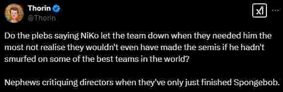 在PGL 克卢日-纳波卡赛事结束后,英国知名电竞记者,分析师Thorin在个人社交媒体账号上发布动态回应了那些批评NiKo在总决赛中个别地图上个人表现不佳让队伍失望的网友。