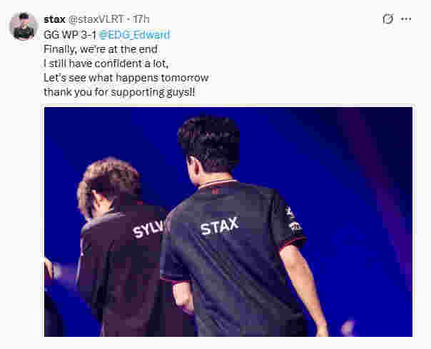 3比1战胜EDG后,T1指挥选手stax发推,原文大意如下: