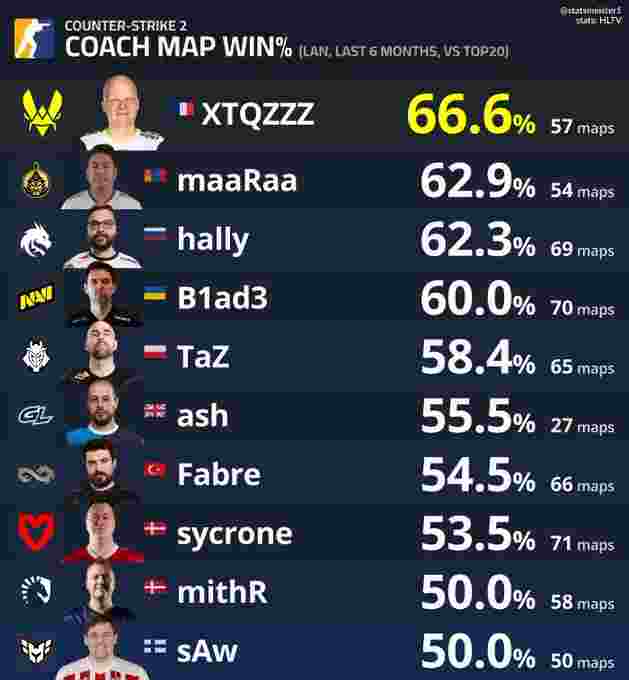 有外媒统计了近半年排名前20的战队教练地图胜率前十名:
