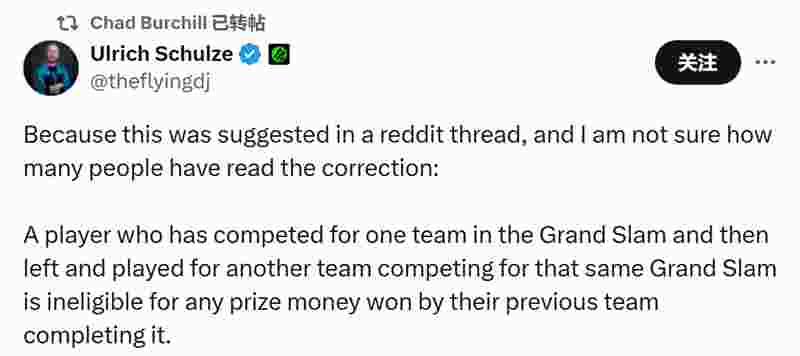 如果一名选手曾代表一支队伍参加大满贯赛事,之后离队并加入另一支队伍参加同一届大满贯赛事,若其前一支队伍拿到了大满贯,那么这名选手无资格获得前一支队伍所赢得的任何奖金。”