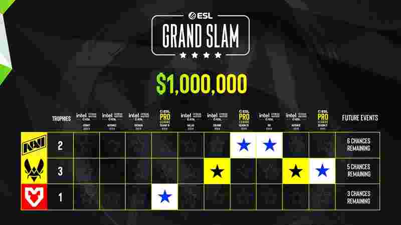 英特尔大满贯奖金100万美元。根据规则,获得英特尔大满贯的队伍必须要在连续十场由ESL举办的大满贯赛事中获得包括IEM 卡托维兹,IEM 科隆或者ESL主办的Major在内的至少一项EPT冠军赛 (EPT CHAMPIONSHIP TOURNAMENT)冠军,并在此基础上还需要收获三项EPT大师赛( EPT MASTERS TOURNAMENT ),诸如IEM 成都或者IEM 达拉斯这些级别赛事的冠军。