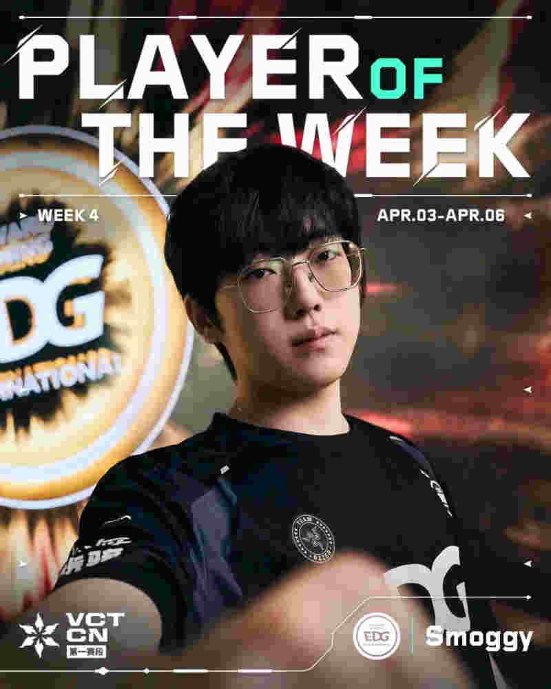 EDG Smoggy在本周与TEC的决胜图隐世修所对决时使用幽影多次在残局下顶住压力,多次以精准的枪法以少胜多,拿下个人单场27杀并斩获MVP!在第四周最佳选手(Player of the Week)评选中选票得分第一,获得了2025 VCT CN联赛第一赛段第四周最佳选手称号!