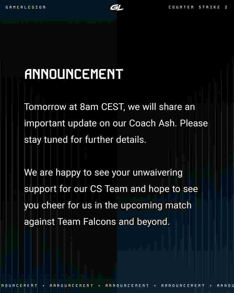 “欧洲中部夏令时间明天早上8点(即北京时间今天下午14点),我们将公布关于我们的教练ash的一项重要消息。请持续关注以获取更多详情。