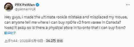 大家好,我犯了一个超级新手的错误,把鼠标放错了地方。有人可以告诉我在加拿大哪里可以买到vaxee的np01s v2吗?我急用,请问多伦多有实体店吗?