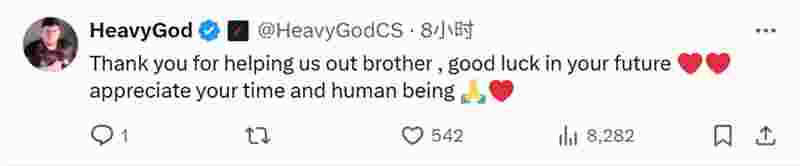 而评论区中,HeavyGod也送上了自己的祝福:“兄弟,谢谢你帮我们,祝你未来好运。感谢你的时间与真诚相待。”