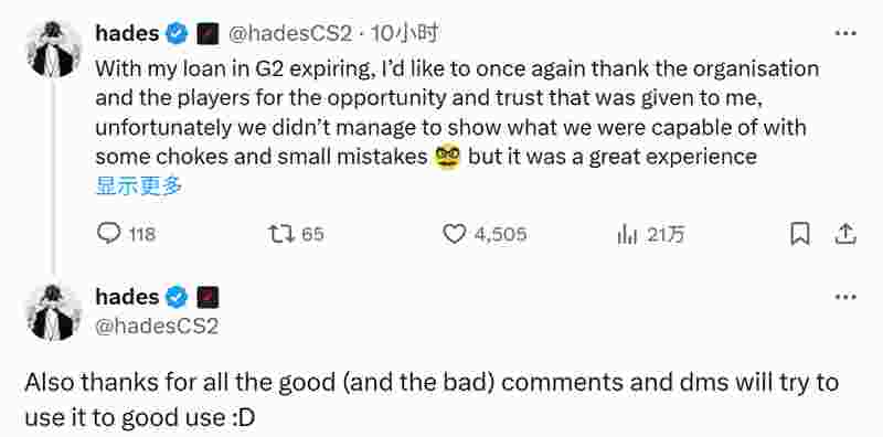 在社交平台上,hades也写道:“随着我在G2的租借期结束,我想再次感谢俱乐部和队员们给予我的机会与信任。遗憾的是,由于一些失误和发挥失常,我们未能展现出真正的实力,但这段经历依然无比珍贵。