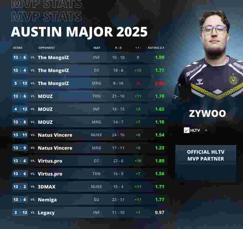 The MongolZ夺冠。赛后HLTV也公布了奥斯汀Major MVP人选,他就是Vitality战队的明星选手ZywOo。