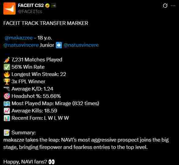 Natus Vincere俱乐部正式官宣18岁青训小将makazze提拔至主队阵容。不过目前尚不清楚makazze将会取代谁的位置。在消息发布后,国外CS对战平台FACEIT公布了这位NAVI新援在天梯比赛中的数据情况。