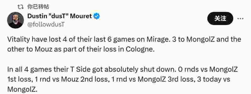 分析师dusT分享了Vitality战队的比赛困局,他认为Mirage进攻方已经成为Vitality的明显短板。