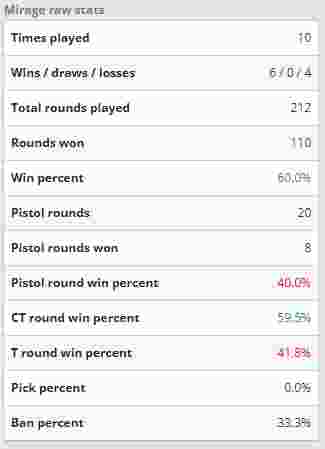在最近10场Mirage地图上的比赛,Vitality的进攻方胜率为41.8%。