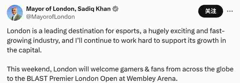BLAST 伦敦公开赛线下总决赛即将打响,而伦敦市长Sadiq Khan也在社交平台上为赛事做宣传,通过提高赛事影响力的方式促进伦敦的经济增长。
