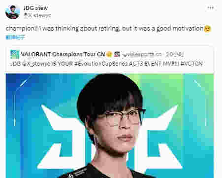 赛后,stew发文:冠军!!我本来想退役的,但这个冠军是很好的动力!!
