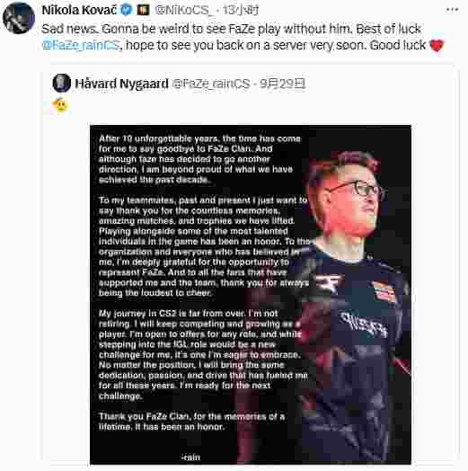 NiKo:令人难过的消息。看到FaZe在没有他的情况下比赛会感觉很奇怪。祝rain一切顺利,希望能很快在赛场上再次见到你。保重!